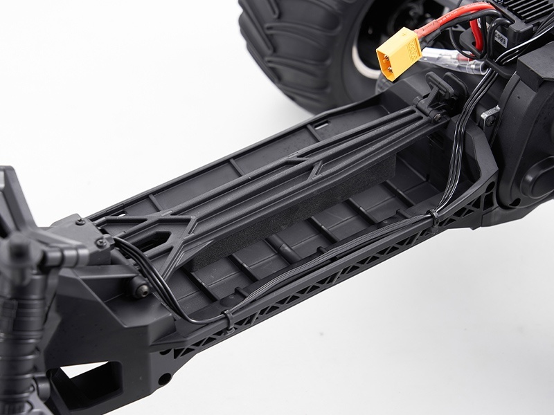 Leistungsstarker Antrieb für jedes Terrain Mit seinem 2WD-Hinterradantrieb und einem kraftvollen 550er-Bürstenmotor liefert der Monstertruck beeindruckende Power. Die massiven Gummireifen bieten optimalen Grip auf unterschiedlichen Untergründen. Der zentral platzierte Akkuträger mit Schnappverschluss erleichtert den Akkuwechsel und ist mit Lipo- sowie NiMH-Akkus kompatibel.