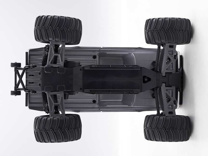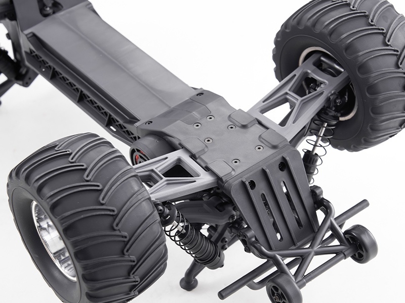 Leistungsstarker Antrieb für jedes Terrain Mit seinem 2WD-Hinterradantrieb und einem kraftvollen 550er-Bürstenmotor liefert der Monstertruck beeindruckende Power. Die massiven Gummireifen bieten optimalen Grip auf unterschiedlichen Untergründen. Der zentral platzierte Akkuträger mit Schnappverschluss erleichtert den Akkuwechsel und ist mit Lipo- sowie NiMH-Akkus kompatibel.