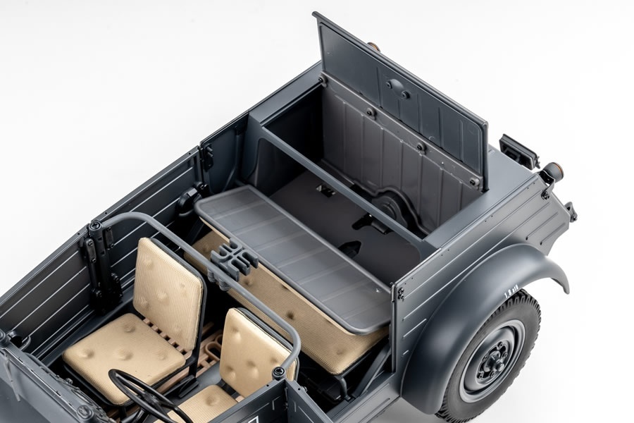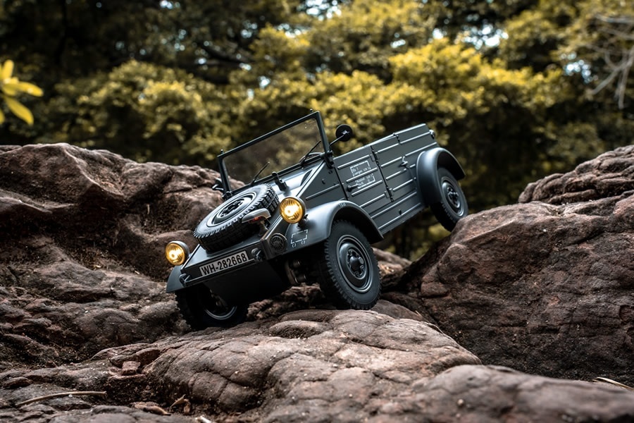 Kurz vorab: Der Typ 82 Kübelwagen kommt mit eingebauter Elektronik komplett fahrfertig und inklusive Fernsteuerung und Akku aus der Box.