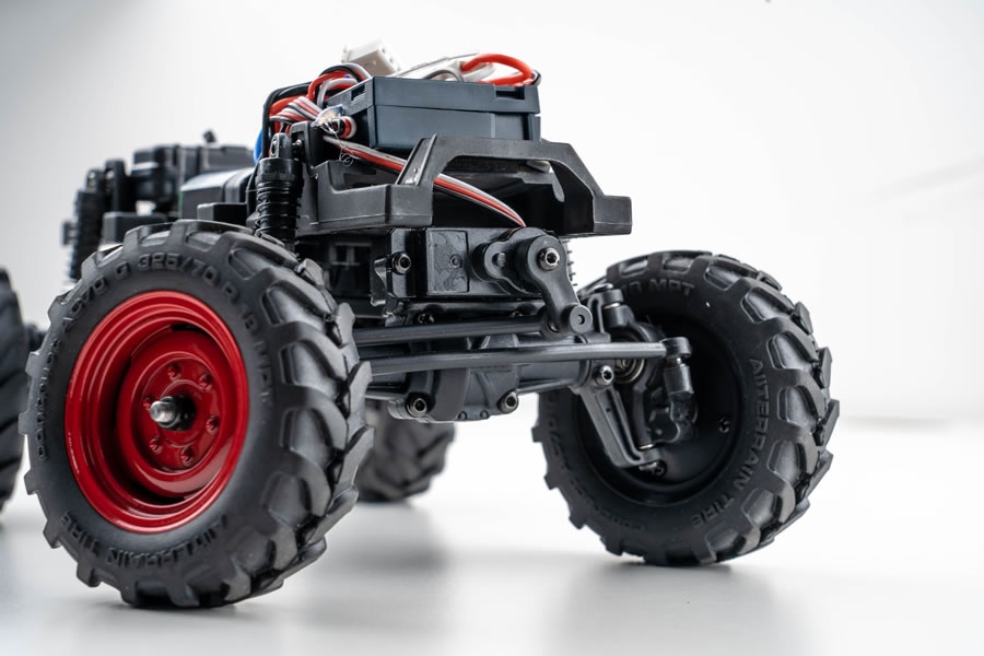 Die Crawler sind in der Regel mit vorderen und hinteren Starrachsen ausgestattet. Standardmäßig ist der FCX24 mit einer geraden Achse ausgestattet, aber das Planetendifferential kann mit hochviskosem Silikonöl ersetzt werden, um den Fahreffekt eines LSD-Sperrdifferenzials zu simulieren. Nach dem Einbau des Differentials kann die ultimative Steigfähigkeit reduziert werden – allerdings sorgt ein kleinerer Wenderadius dabei für ein stabileres Fahrverhalten bei hohen Geschwindigkeiten. Einfach ausgedrückt ist die gerade Achse für extreme Steigungen und das Differenzial für Hochgeschwindigkeitsfahrten im Gelände geeignet. Du hast die Wahl!