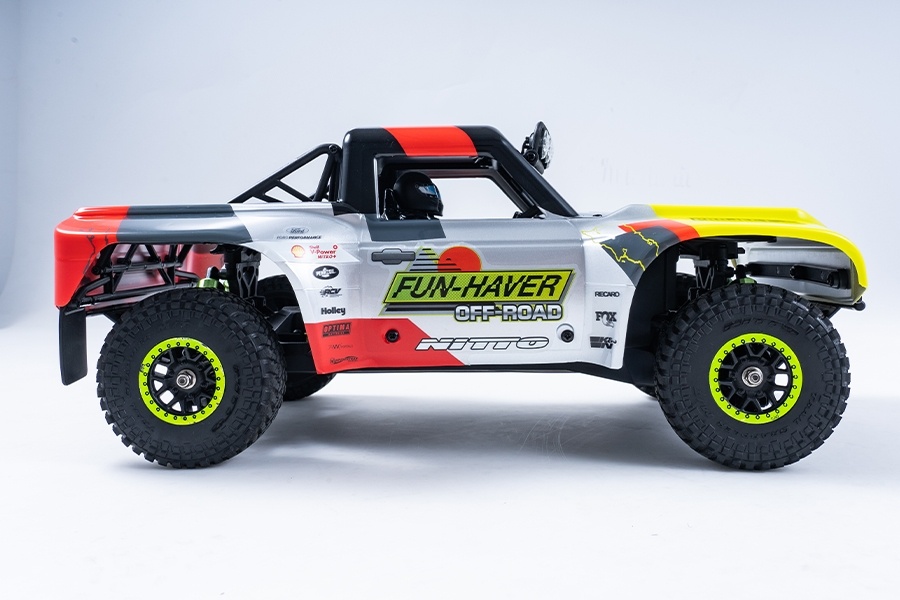 Design & Realismus - kompakt, aber detailliert Die Polycarbonat-Karosserie wurde mit viel Liebe zum Detail gestaltet: Frontgrill, Spiegel, Scheinwerfer, Rücklichter und sogar ein Cockpit mit Fahrerfigur sind vorhanden. Die Lackierung im typischen Fun-Haver Racing Look mit Sponsorenlogos (Ford, Nitto, Shell, FOX) sorgt für einen authentischen Motorsportauftritt - auch im Regal.