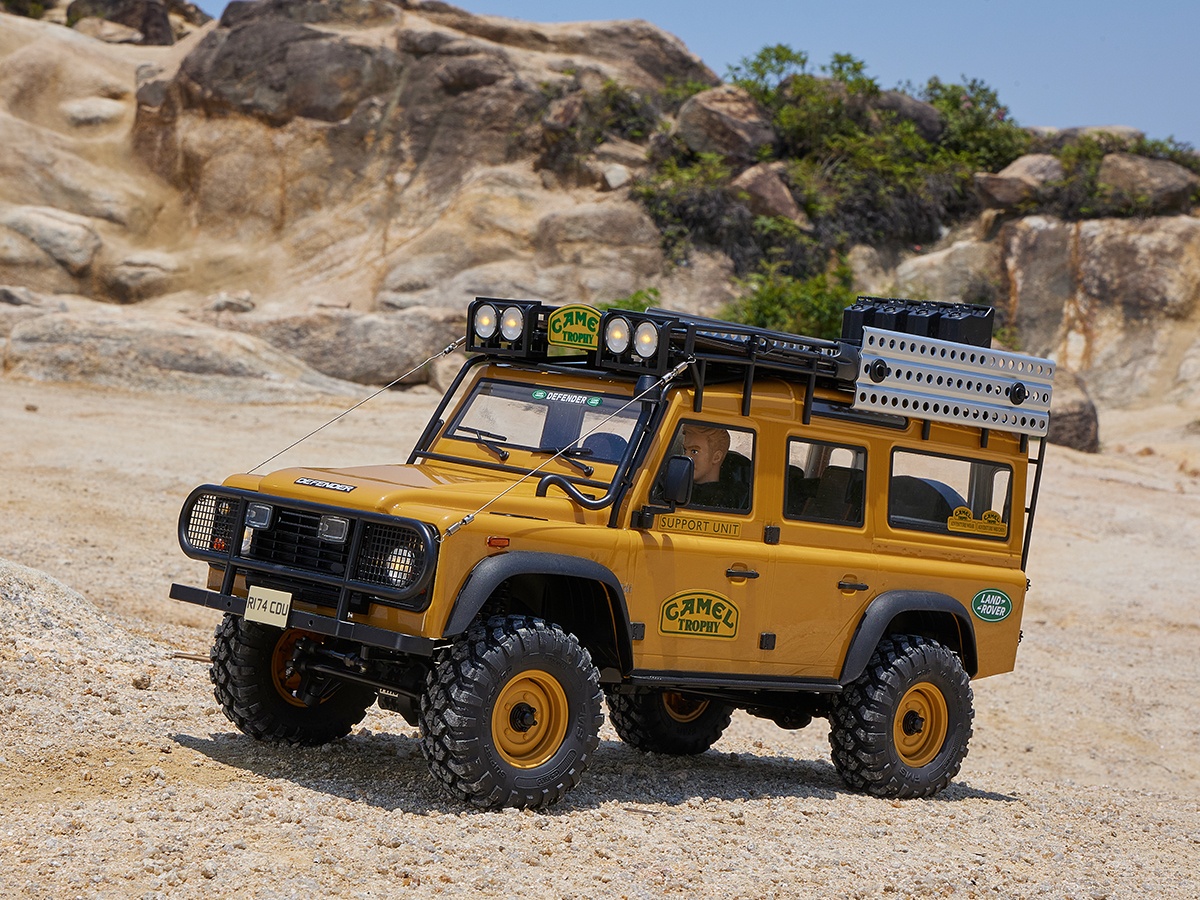 Lichtsystem & Zubehör inklusive Bereits ab Werk sind Scheinwerfer und Rücklichter installiert und lassen sich über die Fernsteuerung schalten. Zusätzlich sorgen Spotlights auf dem Dachgepäckträger für stimmungsvolle Nachteinsätze. Die beiliegenden Camel Trophy-Zubehörteile unterstreichen das Abenteuer-Flair jedes Modells.