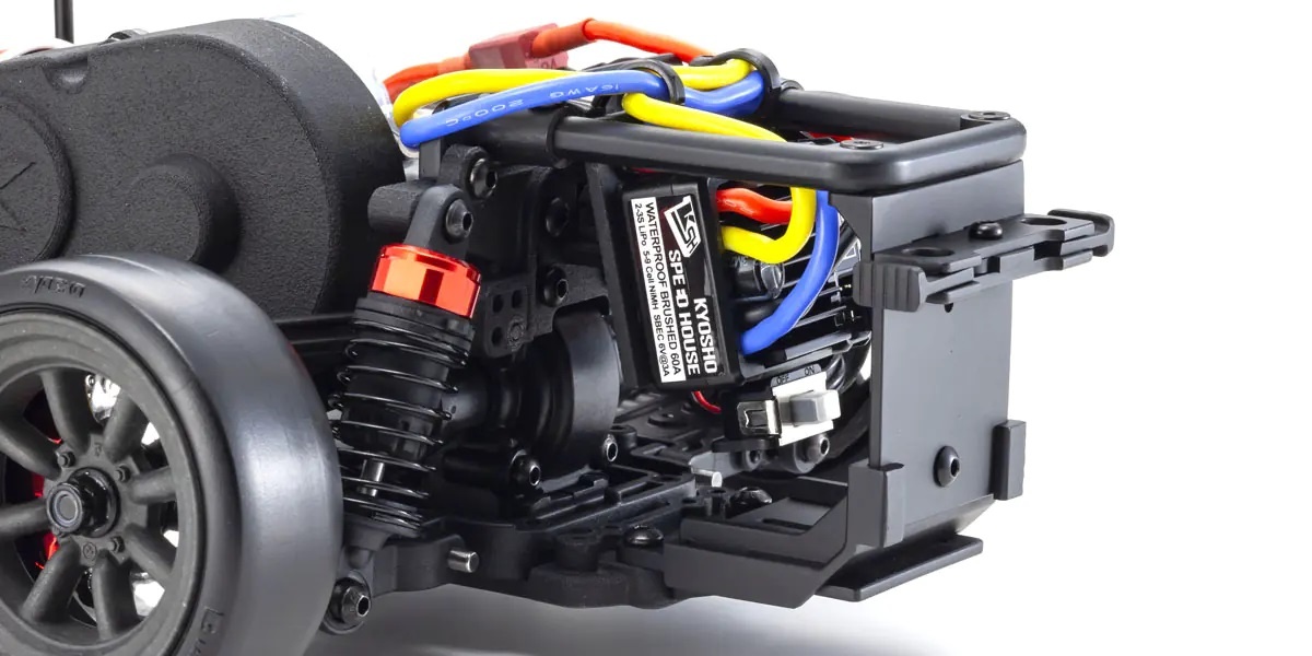 - Ausgestattet mit einem neu entwickelten KRG-331D-Empfänger mit integrierter Gyro-Einheit, die für das Driften optimiert ist. Der Gyro moderiert sowohl die Lenkung als auch die Drosselklappe (Geschwindigkeitsregelung), und die Verstärkung (Empfindlichkeit) beider kann mit einem Drehknopf eingestellt werden.