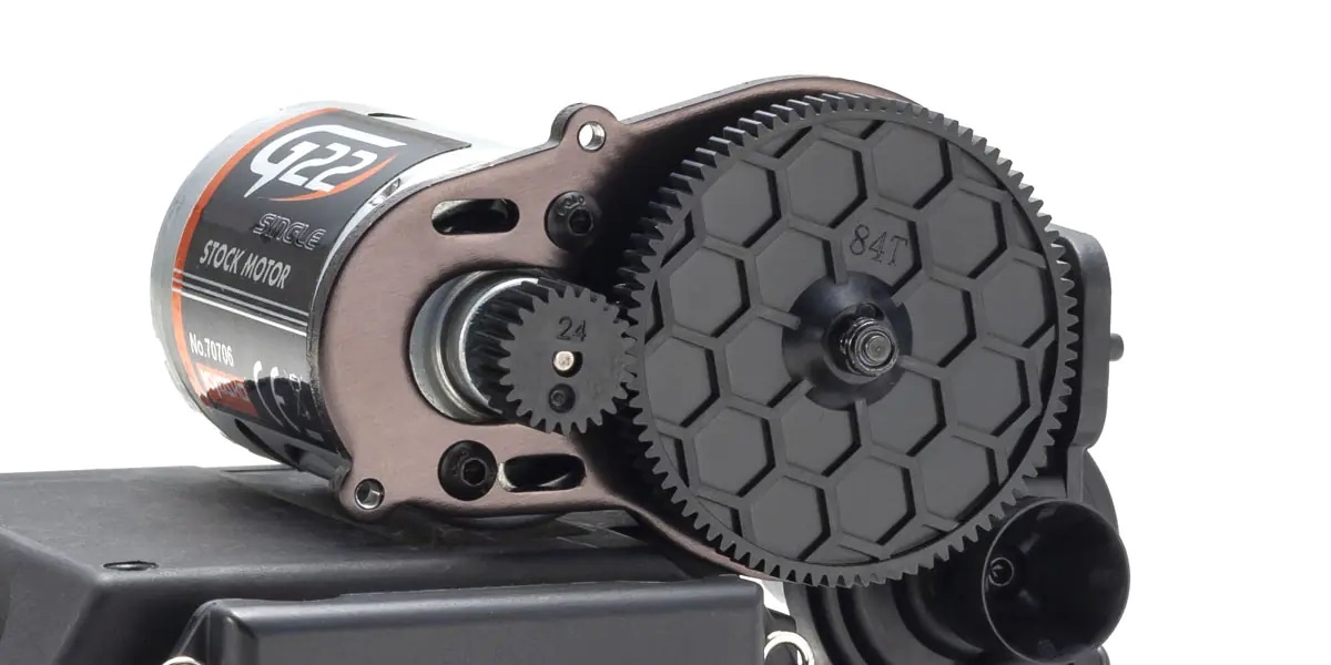 - Durch die Motorhalterung entfällt die schwierige Einstellung des Zahnradspiels (Eingriff). Das Übersetzungsverhältnis kann mithilfe der Langlochbohrung an die Kyosho 48P 16-37T-Ritzel angepasst werden.
