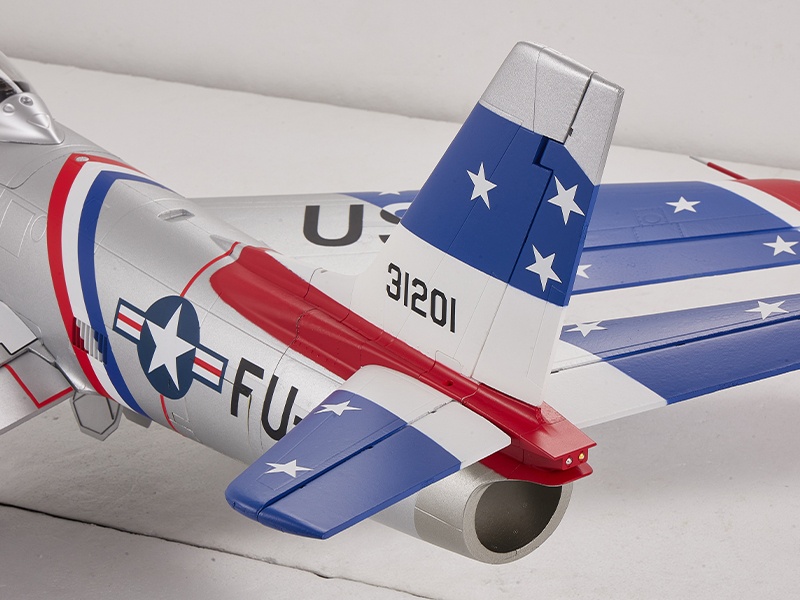 Die 80mm F-86 von FMS ist ein originalgetreuer RC-Jet aus EPO-Hartschaumbauweise mit 1,22m Spannweite. Das Modell kommt nahezu flugfertig aus der Box – inklusive zahlreicher Scale-Details, einem elektrischen Einziehfahrwerk, einem effizienten 12-Blatt-Impeller und funktioneller Beleuchtung. Wie das Orginal Wie ihr maßstabsgetreues Pendant zeichnet sich die FMS 80mm F-86 durch ein realtitätsnahes Farbdesign und zahlreiche Scale Details aus.. Entwickelt, um sowohl das Aussehen als auch die Leistung des echten Jets nachzubilden, hat FMS seine jahrzehntelange Erfahrung in die Konstruktion der 80mm F-86 eingebracht. Details wie Pilotenfigur, Cockpitausstattung, Verkleidungen, Zusatztanks, Fahrwerksklappen, usw. und dynamische Merkmale wie funktionelle LED-Navigations- und Landelichter, ein stoßdämpfendes elektrisches Einziehfahrwerk, funktionelle Landeklappen machen das Modell zu einem echten Hingucker. Enorm hoher Vorfertigungsgrad Wie alle anderen FMS-Flugzeuge wurde auch die 80mm F-86 mit dem Ziel entwickelt, die Bauzeit auf ein Minimum zu reduzieren. Die zweiteilige Rumpfkonstruktion reduziert das Packmaß um 30 Prozent, wodurch sich die F-86 auch auf engem Raum transportieren lässt. Funktionsfähige Beleuchtung Die F-86 ist mit einer Vielzahl von Lichteffekten ausgestattet, darunter Navigationslichter (links rot, rechts grün), Düsen-Navigationslichter (eines rot, eines weiß) und Landescheinwerfer (weiß), die das authentische Aussehen des Jets unterstreichen. Fertig eingebaute Elektronik Die komplette Elektronik ist fertig in dem Modell verbaut. Der 80mm 12-Blatt-Impeller wird von einem 3665er Innenläufer und einem 100A Hochleistungsregler angetrieben. Insgesamt 11 Digitalservos mit Metallgetriebe führen die Steuerbefehle schnell und zuverlässig aus. Auch das elektrische Einziehfahrwerk ist fertig im Modell verbaut und verkabelt. Eigenschaften:- Konstruktion aus extrafestem und leichtem EPO-Hartschaummaterial