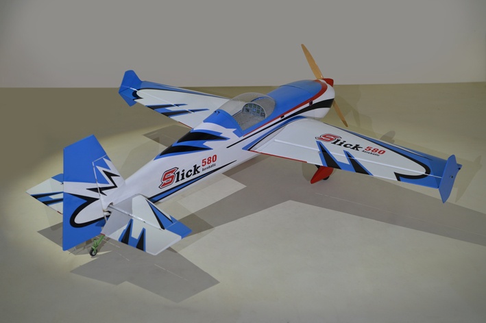 Holzkonstruktion mit enorm hohen Vorfertigungsgrad Das Modell ist in extrem leichter und verstärkter Holzbauweise gefertigt. Dabei besticht die lasergeschnittene Konstruktion durch einen enorm hohen Vorfertigungsgrad, wodurch sich der Bauaufwand nahezu auf den Einbau von Antrieb und Elektronik reduziert. Unter der großen abnehmbaren GFK-Kabinenhaube befindet sich viel Platz für den Einbau der Elektronik. Die Slick 580 ist komplett fertig mit Folie bespannt.
