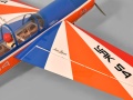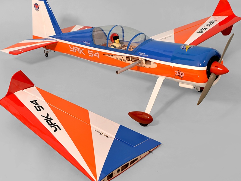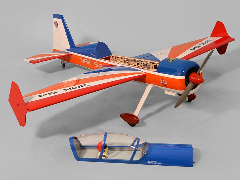 Holzkonstruktion mit enorm hohen Vorfertigungsgrad Das Modell ist in extrem leichter und verstärkter Holzbauweise gefertigt. Dabei besticht die lasergeschnittene Konstruktion durch einen enorm hohen Vorfertigungsgrad, wodurch sich der Bauaufwand nahezu auf den Einbau von Antrieb und Elektronik reduziert. Unter der großen abnehmbaren GFK-Kabinenhaube befindet sich viel Platz für den Einbau der Elektronik. Die Yak-54 ist komplett fertig mit Folie bespannt.