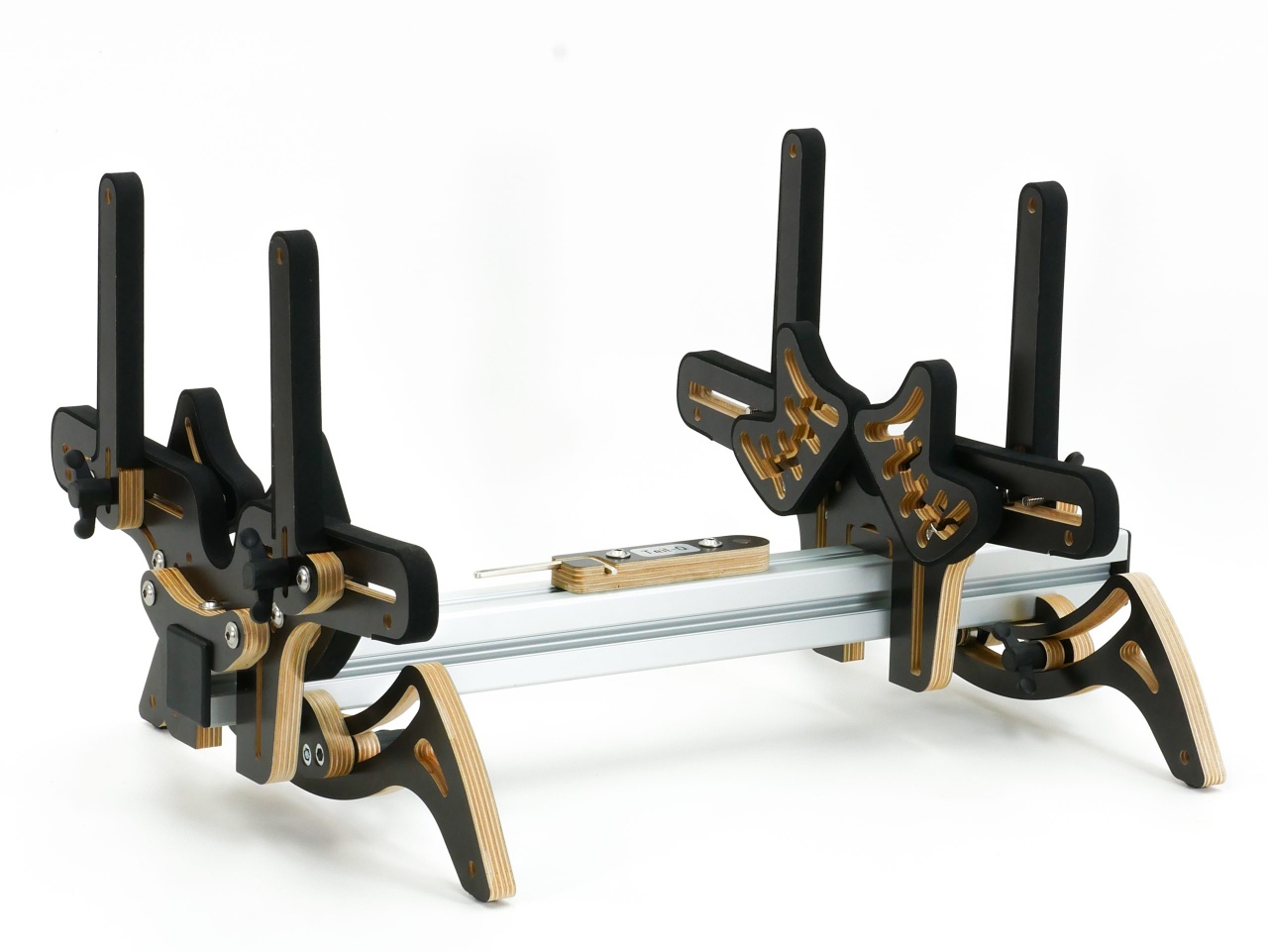 Die Langlöcher in den Seitenteilen sind zum Befestigen der einzelnen Halteelemente. Die anpassbare Auflage kann gedreht werden und hat je Seite eine unterschiedliche Form, um das Modell sicher zu lagern. Die Halter können auch als Fixierung verwendet werden. Die Haltearme werden ebenso in einer Nut befestigt und sind verdrehgesichert. Das ermöglicht einen sicheren Halt bei Arbeiten am Modell, wenn zum Beispiel der MultiFix geschwenkt wird oder beim Transport im Auto.
