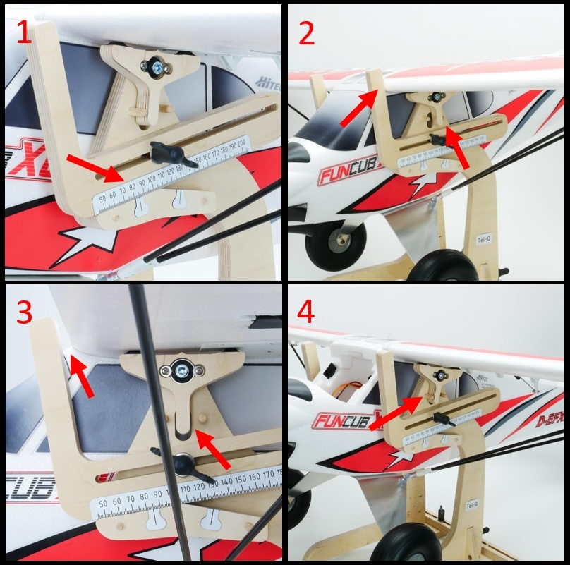 1: Stellen sie den angegebenen Schwerpunkt für ihr Modell mit Hilfe der Skala ein. Der Anschlag kann je nach Modell in beiden Richtungen verwendet werden. Achten sie beim Einstellen darauf, dass der Anschlag sauber auf der Führung aufliegt. Bei schwereren Modellen ist eine Fixierung der Schwerpunktwaage an der Grundplatte mit jeweils einer Schraubzwinge empfohlen.