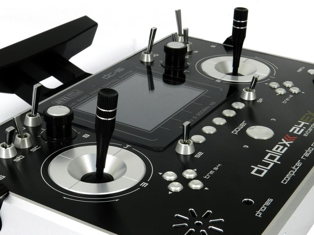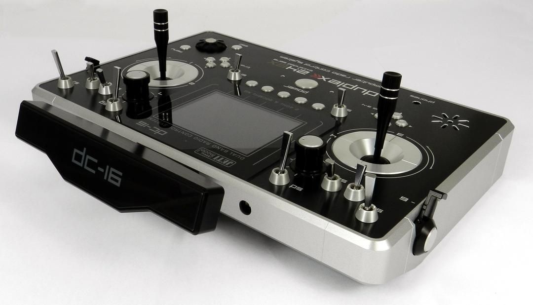Die neuen Sender DC-16 und DS-16 sind in Zusammenarbeit mit professionellen Piloten und Weltmeistern entstanden. Sie wurden mit dem Ziel maximaler Anwenderfreundlichkeit entwickelt, wobei einfache Bedienung, maximale Lebensdauer und Zuverlässigkeit der mechanischen, elektrischen und elektronischen Bauteile im Mittelpunkt standen. Das aus dem Vollen gefräste Metallgehäuse bietet maximalen Schutz des Innenlebens und der Oberfläche gegen mechanische Einwirkungen sowie Chemikalien, einfache Formen sind außerdem sehr wartungsfreundlich. Die mehrfach kugelgelagerten und hochpräzisen Knüppelaggregate aus Metall lassen den revolutionären Lösungsweg der Konstruktion erkennen. Berührungslos und verschleißfrei arbeitende Hall-Magnetsensoren ermöglichen eine Auflösung von 4096 Schritten und garantieren einen zuverlässigen, wartungsfreien Langzeitbetrieb. Das hintergrundbeleuchtete Farb-LCD-Display ist nach ergonomischen Grundsätzen angeordnet und bietet eine ausgezeichnete Lesbarkeit bei jeder Beleuchtungsart und jedem Blickwinkel. Die hohe Aufösung des Displays ermöglicht den Einsatz von Grafiken, somit konnten eine einfache und intuitive Programmierung und Bedienung realisiert werden.
